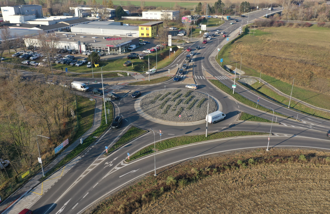 Nová jednopruhová okružní křižovatka o průměru prstence 38,00 m byla pro zvýšení kapacity vybavena samostatnými větvemi (bypassy) ve třech kvadrantech křižovatky. Stávající zastávky MHD Slatina, rozcestí byly vybaveny zastávkovými zálivy a novými nástupišti, současně prošly úpravou navazující chodníky a přechody pro chodce. Nově byl vybudován přechod pro chodce přes ulici Hviezdoslavovu. Stavba dále zahrnuje vyvolané přeložky inženýrských sítí a také další související stavební objekty.