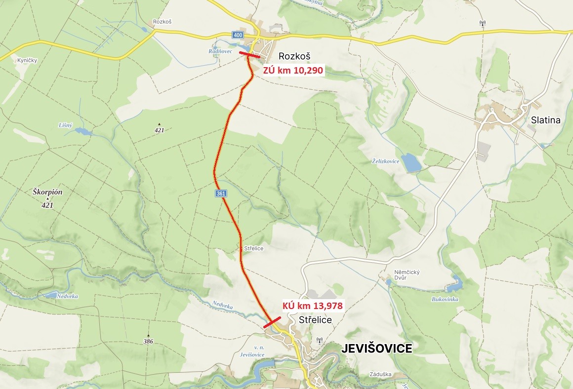 Stavbou je provedení výměny obrusné a ložné vrstvy vozovky v celé šíři na silnici II/361 Rozkoš - Střelice, v úseku km 10,290 – 13,978. Oprava spočívá ve výměně obrusné vrstvy z ACO 11 + v tl. 50 mm a výměně ložné vrstvy z ACL 16+ také v tl. 50 mm. Dále provedení VDZ (středová čára) v úpravě plast, zpevnění krajnic z recyklovaného materiálu v tl. 100 mm, včetně všech souvisejících prací.