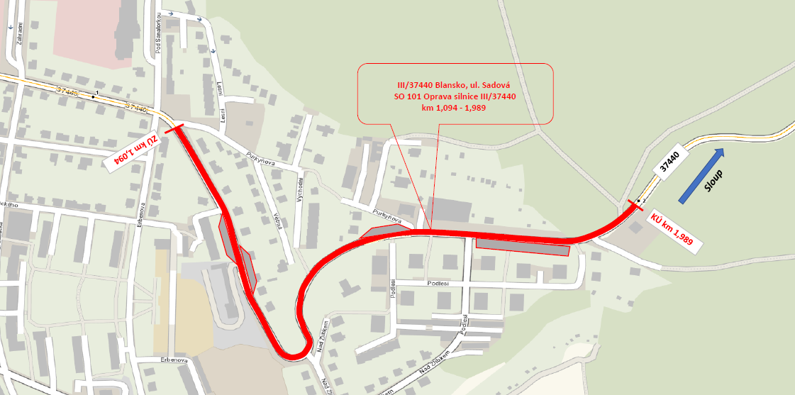 Stavbou je provedení celoplošné opravy asfaltového krytu na úseku silnice Předmětem zakázky je oprava silnice III/37440 v intravilánu města Blansko na ul. Sadová. Oprava povrchu silnice v km 1,094 – 1,989 bude provedena celoplošným frézováním stávajícího povrchu, lokální sanací, výškovou úpravou šachet a mříží, spojovacím postřikem, novou obrusnou vrstvou ACO 11+ v tl. 50 mm, demontáží a montáží svodidla dl. 90 m, ošetřením pracovních spár a realizací VDZ. Délka opravy je 0,895 km. Součástí dodávky je i vyřízení, stanovení a realizace PÚP.