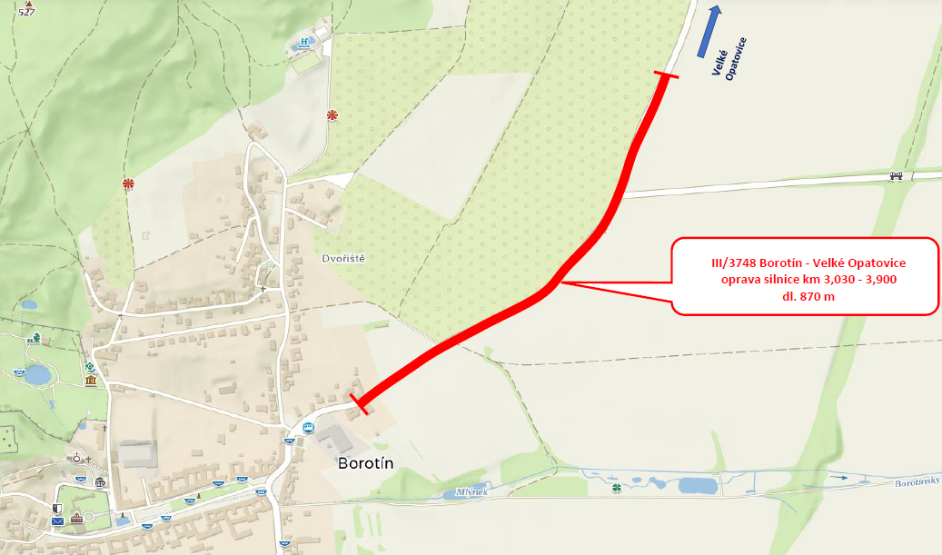Stavbou je oprava silnice III/3748 v extravilánu od konce zástavby obce Borotín směr Velké Opatovice. Silnice III/3748 – oprava povrchu silnice v km 3,030 – 3,900; bude provedeno lokální frézování stávajícího povrchu, lokální vyrovnání krajů vozovky, spojovací postřik, nová obrusná vrstva ACO 11+ v tl. 50 mm, ošetření pracovních spár, provedení vodorovného dopravní značení barvou.