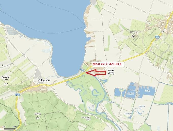 Prohlídkou mostu ev. č. 421-012 překlenující řeku Dyji v blízkosti vodní nádrže Nové Mlýny bylo zjištěno, že špatný stav mostu ovlivňovaly především závady spojené s dlouhodobým zatékáním do nosné konstrukce a spodní stavby a jejich spolehlivé odstranění si vyžádalo obnovu celého mostního svršku, tedy jeho náhradu novým.