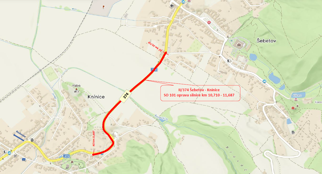 Stavbou je provedení celoplošné opravy asfaltového krytu na úseku silnice II/374 v extravilánu mezi obcemi Šebetov a Knínice a částečně v intravilánu obce Knínice. Oprava povrchu silnice v km 10,710 – 11,687; bude provedeno lokální frézování stávajícího povrchu, lokální sanace krajů vozovky z ACL 16+, spojovací postřik, nová obrusná vrstva ACO 11+ v tl. 50 mm, ošetření pracovních spár, VDZ, úprava nezpevněné krajnice. Součástí stavby je i vyřízení, stanovení a realizace PÚP.