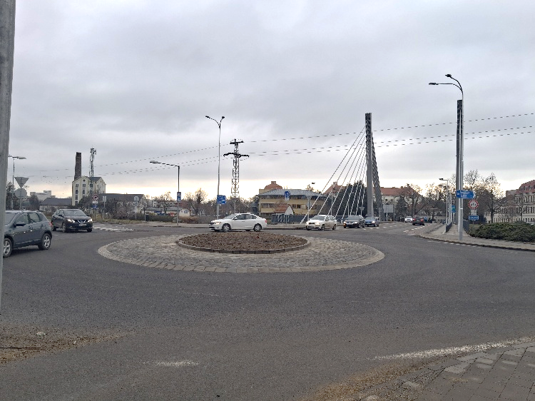 Okružní křižovatka byla navržena z důvodu optimálnějších vlečných křivek a minimalizace záboru plochy náměstí elipsového tvaru. Šířka jízdního pruhu je navržena 7,00 m, šířka středového prstence 3,00 m. Hlavní poloměr vnější elipsy je 15,5 m a vedlejší poloměr 13,0 m. Zaoblení, dopravní ostrůvky a šířky jízdních pruhů jsou navrženy dle vlečných křivek. Mimo větev na mostě ev.č. 416-013 jsou vjezdové a výjezdové větve rozděleny dopravními ostrůvky. Na těchto ostrůvkách jsou zřízeny sdružené přechody pro chodce a cyklisty.