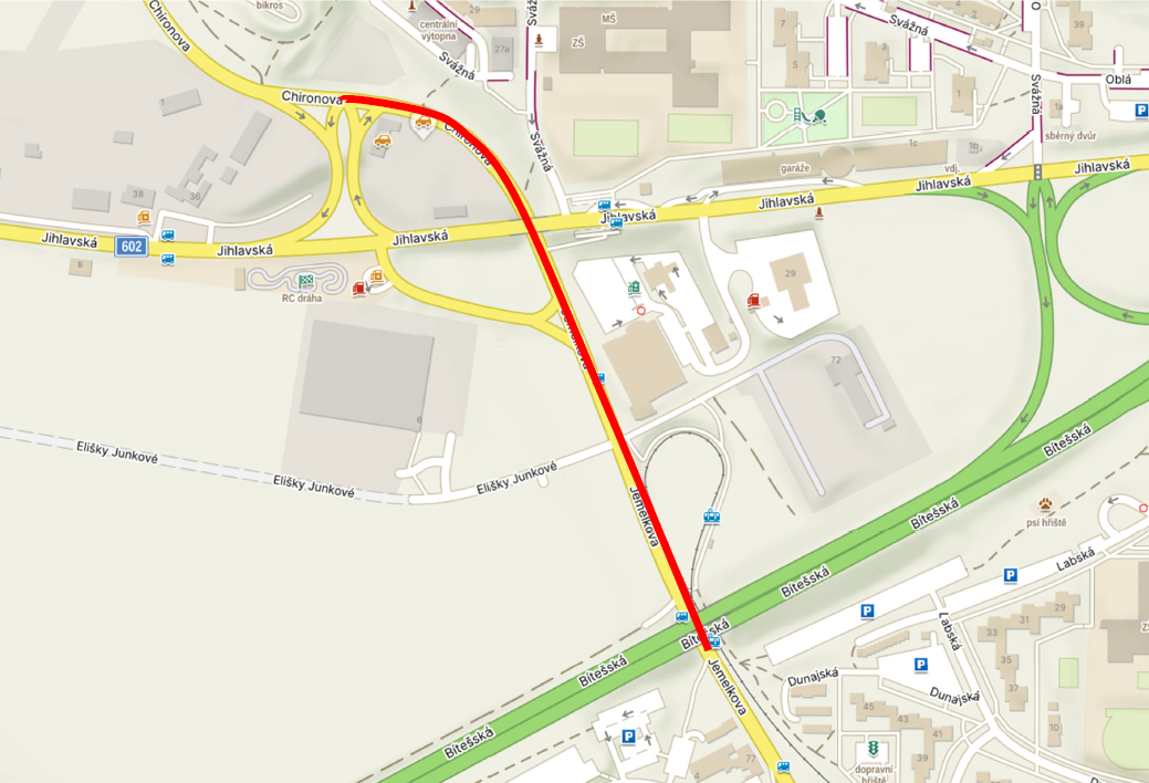 Předmětem stavby je obnova asfaltového krytu včetně provedení lokálních sanací silnice III/15272 – části ulic Jemelkova a Chironova v Brně v úseku od mostu na Bítešské přes Jemelkovu po pracovní spáru v polovině křižovatky s rampami Chironova, v souladu se zpracovanou DGN silnice. U konečné tramvaje je autobusový záliv. Součástí stavby je výšková úprava všech uličních vpustí (poklopů) a dalších vnějších znaků IS, předláždění, případně odstranění, přídlažby ze žulových kostek z důvodu zajištění odvodnění vozovky, obnova příkopů a rigolů, případná výměna (doplnění) poškozených obrubníků, a obnova VDZ plastem. Délka úseku je cca 0,550 km. Stavba bude probíhat po částech, s řízením provozu pomocí SSZ. Příjezd na staveniště je možný z navazujících ulic.