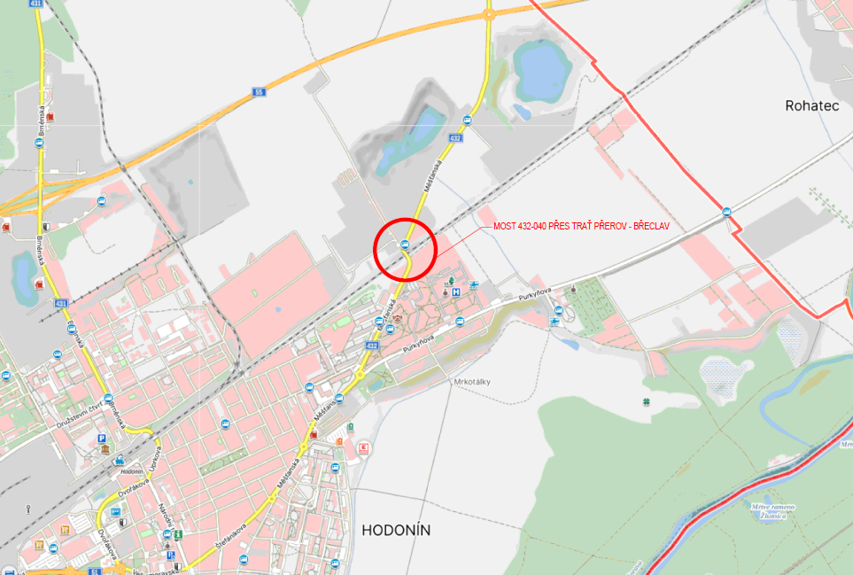 Stavbou je rekonstrukce mostu ev.č. 432-040 ve městě Hodonín, který převádí silnici II/432 přes trať Přerov- Břeclav. Stávající třípólový mostní objekt o délce přemostění 30,42 m a volné šířce 7,10 m, jehož nosnou konstrukci tvoří celkem 7ks ocelových svařovaných nosníků bude demolován. Je navržen nový jednopólový betonový most z předpjatých ŽB nosníků se spřahující ŽB deskou, uložení na hrncová ložiska, rozpětí nového mostu 20,0 m, šířka nosné konstrukce kolmo 12,30 m a kolmá délka NK 21,70 m. Volná šířka mezi obrubami je 8,75 m, na levé straně mostu je navržena římsa š. 0,80 m a na pravé straně je římsa široká 3,30 m. Spodní stavbu tvoří železobetonové monolitické opěry tl. 2,20 m. Na opěry mostu navazují železobetonová mostní křídla tl. 0,55-1,00 m. Založení mostu je hlubinné. Římsy jsou navrženy monolitické železobetonové. V rámci stavby bude dále provedena úprava silnice II/432, úprava MK a sjezdů, přeložka VO, přeložka kabelů, provedena náhradní výsadba a ochrana inženýrských sítí.